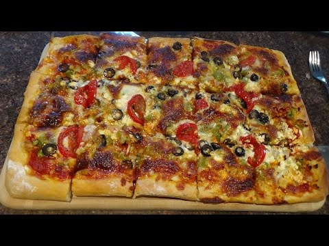 Pizza With Feta Cheese And Tomatoes }}- Make (yeast, flour, water, little sugar) or buy pizza dough.......spread dough on oiled cookie sheet.....put: sliced pepperoni, cooked Italian sausage, shredded ...